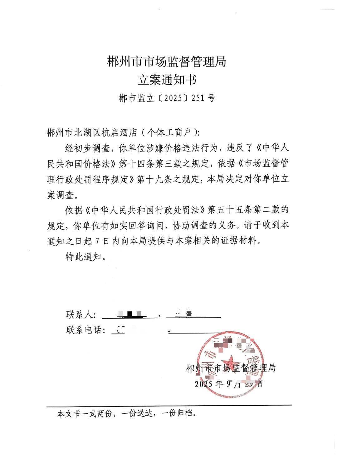 严查快处酒店价格违法行为!郴州市一酒店被立案查处2025年9月29日,郴州市市场监管局接群众投诉,其预定的郴州市欢漫酒店(登记名称为郴州市北湖区杭启酒店),其预定日期为10月3日,价格为160元/晚,被平台以“酒店调错价格”为由单方面取消订单,随即该酒店的同一房型,价格已涨至600多元。接到投诉后,郴州市市场监管局立即组织执法人员对该酒店进行现场检查,检查中发现,群众举报属实,且该酒店还涉嫌其他价格违法行为,郴州市市场监管局已对郴州市欢漫酒店(登记名称为郴州市北湖区杭启酒店)进行立案调查,处理结果将及时向社会公示。下一步,郴州市市场监管局将持续严格价格监管,切实规范国庆中秋假期市场价格收费和竞争行为,欢迎广大消费者对经营者进行监督,若发现违法问题线索,请拨打12315热线投诉举报,市场监管部门将依法依规严厉查处,切实守护消费者权益。